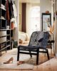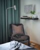 Living room corner with neutral walls, black easy chair, grey throw, near mirror with black frame, cream-coloured curtains.